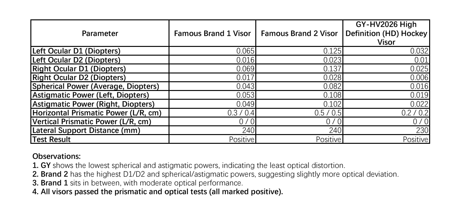 Most importantly, the GY-HV2026 passed all official prismatic and optical compliance tests with a Positive rating—a non-negotiable for competitive and league-approved hockey gear. This means players get industry-leading optical performance without compromising on safety or regulatory compliance.