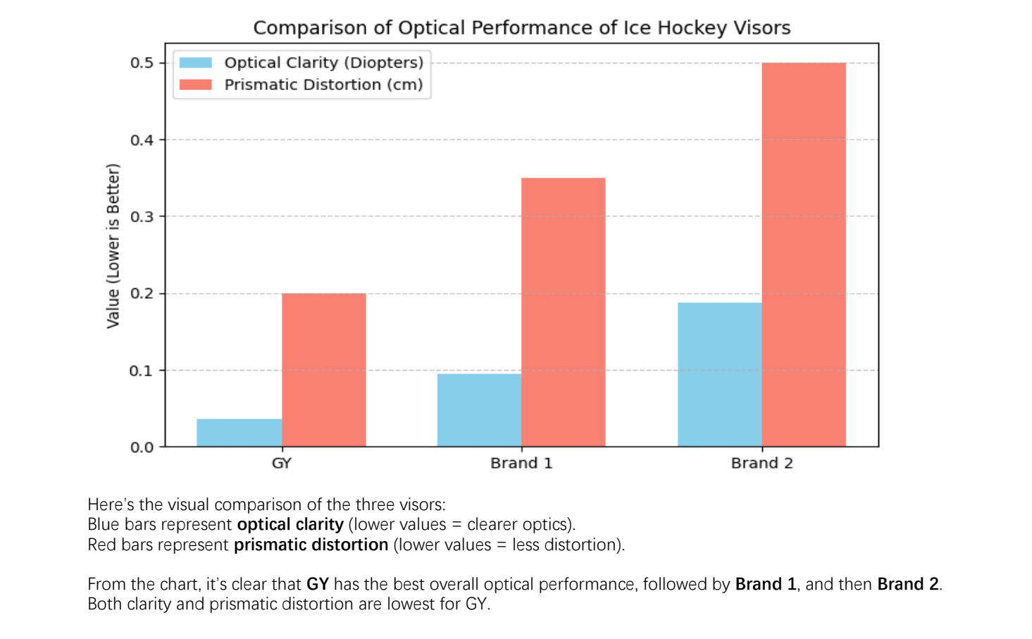 After months of research and precise optical laboratory testing, the GY-HV2026 underwent a comprehensive assessment of its core optical indicators - these indicators are the same as the benchmark standards used for certifying professional ice hockey protective gear - and was also tested alongside two globally renowned and famous ice hockey mask brands. Each tested mask passed the official optical and prism compliance standards, but the GY-HV2026 stood out in every key performance category. The test data proved that its outstanding optical design can eliminate the visual distortions that may cause sluggish reactions, affect judgment, and reduce safety on the ice rink.Unrivaled Optical Clarity: The Lowest Distortion in Testing